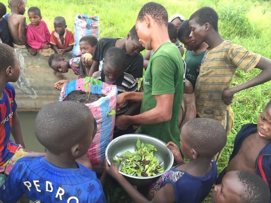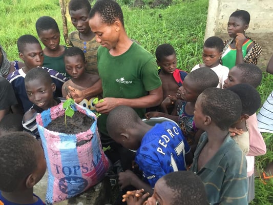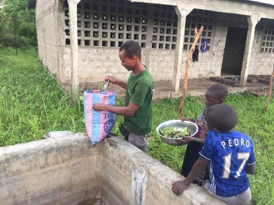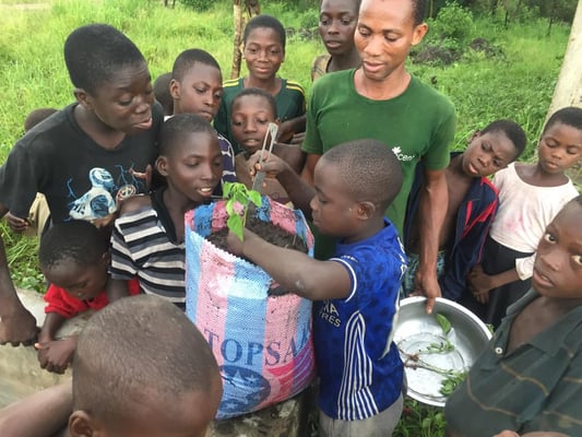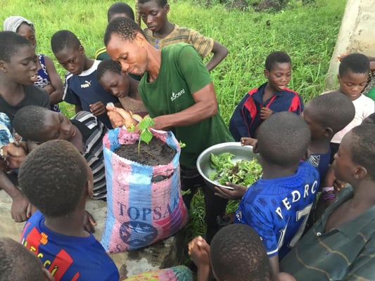 Neuigkeiten aus unserem Schulwald/ Schulgartenprojekt in Kotokope. Kossivi und die Kinder pflanzen Salat an. Das machen sie aber anders als üblich, nämlich in Säcken, die mit Erde gefüllt werden. Das hat auch einen guten Grund! Könnt Ihr Euch denken welcher das ist? Den Kindern macht das unheimlich viel Spaß und sie lernen dabei, wie man mit Salat dazu beitragen kann gesunde, grüne Bestandteile der täglichen Nahrung, die in erster Linie aus Manjok besteht, beizusteuern.