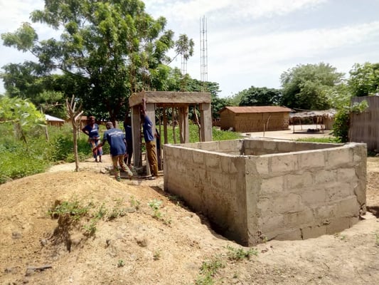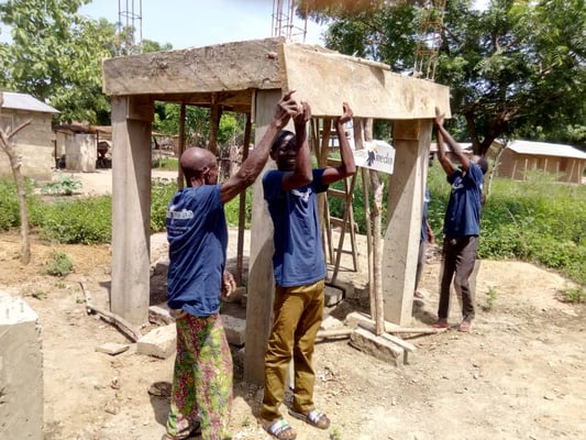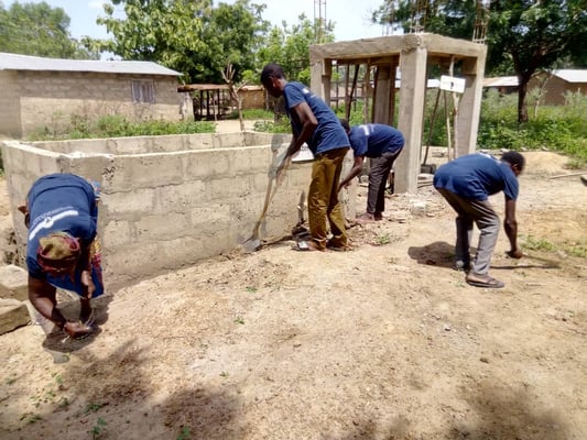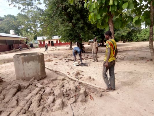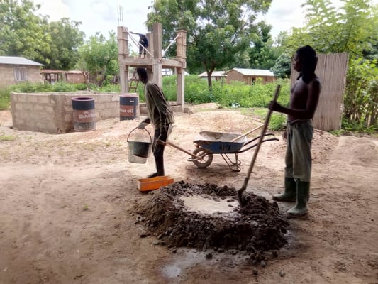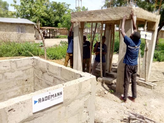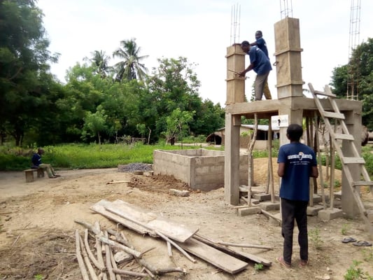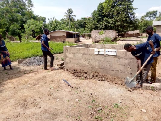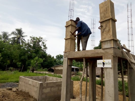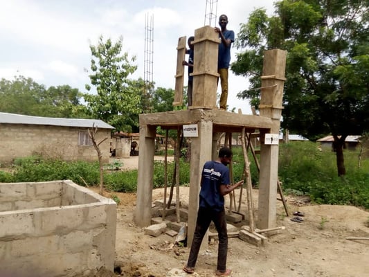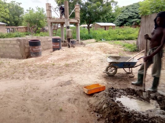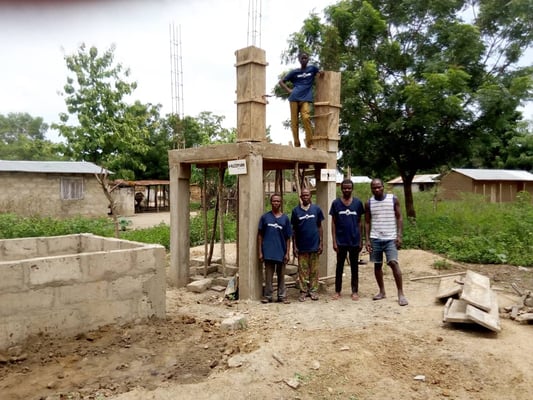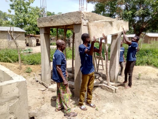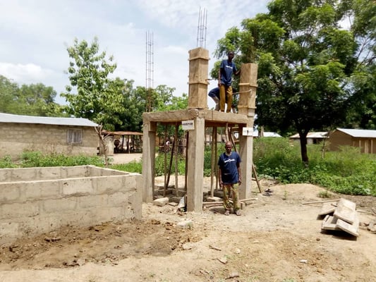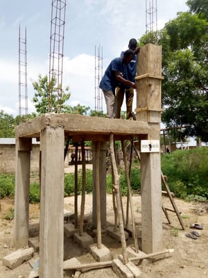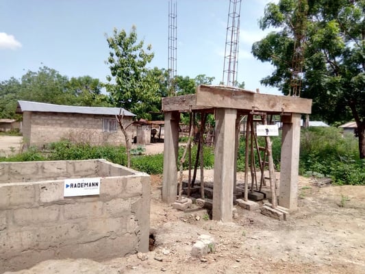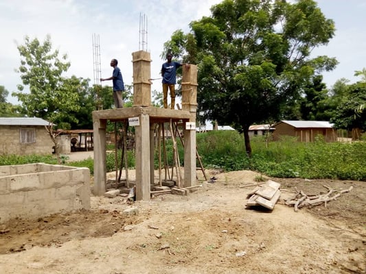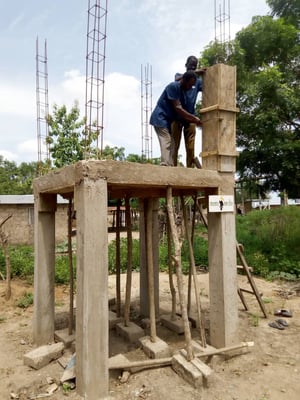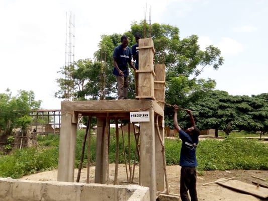 Jetzt, wo wir wieder Zement geliefert bekommen haben, kann der Bau des Wasserturms weitergehen. Zement ist, obwohl es in Togo eine Heidelberger Zementfabrik gibt erstens teurer als in Ghana und selten zu bekommen. Verschalt und mit Eisen ausgelegt werden die Stützpfeiler für die nächste Plattform gegossen. Angerührt wird der Zement vor dem Wasserturm, das spart Transportwege und eine Mischmaschine gibt es eh` nicht.