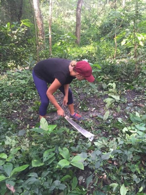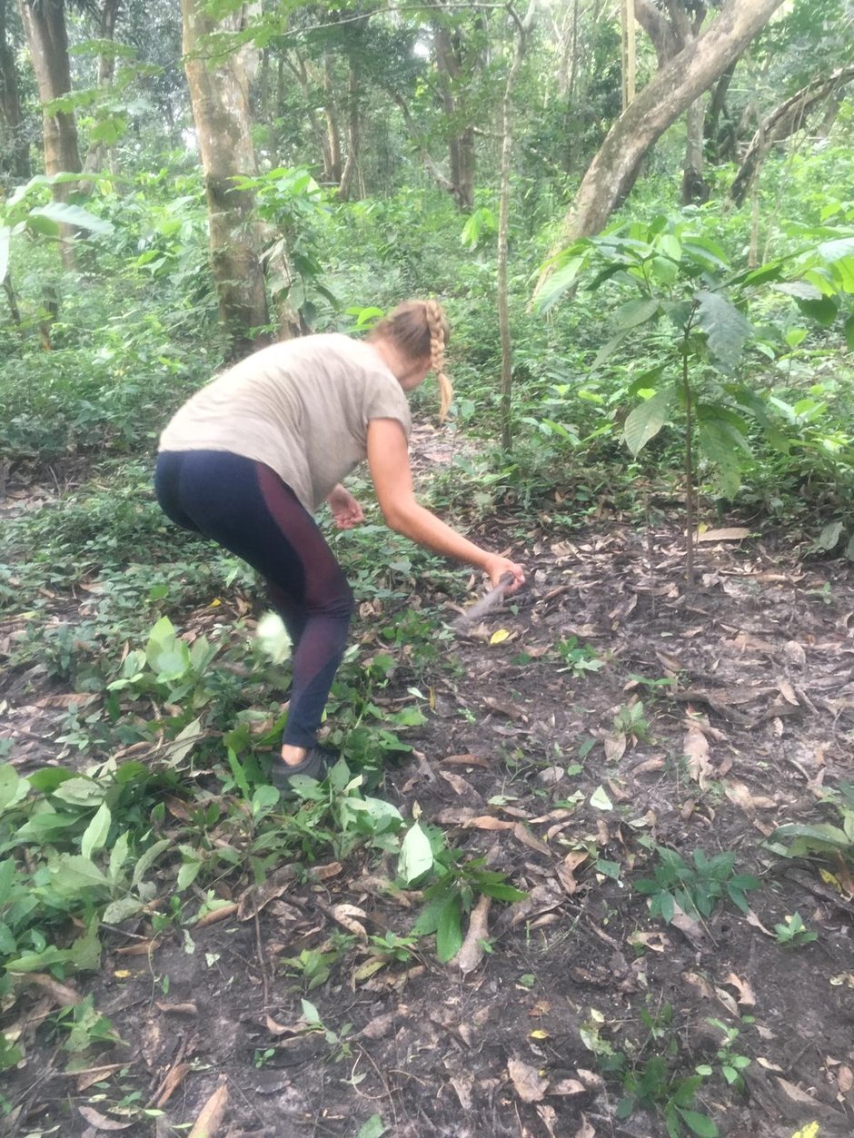Vor etwa zwei Jahren haben wir begonnen, in unseren Mangowald die ersten Kakaosetzlinge zu integrieren. Eine der wichtigen Aufgaben, die wir mehrmals im Jahr durchführen müssen, ist das Freischneiden der Kakao Pflanzen. In der Regel erledigen unser Mitarbeiter der Baumschule diese Arbeiten mit. In diesem Herbst ist das aber anders. Wir haben drei Studentinnen der FH Bingen, die eine Bachelor-Arbeit zum Thema Klimawandelanpassung schreiben zu Besuch in PROJECT TOGO. Isabell, Sophie und Janina ließen es sich aber nicht nehmen, die Arbeiten in der Kakaopflanzung zu unterstützen. Nachdem wir ihnen gezeigt haben, wie man mit dem Hauptarbeitsgerät, der Machete, umgeht, haben sie in nur einem Tag alle Pflanzen vom wuchernden Gras freigeschnitten.